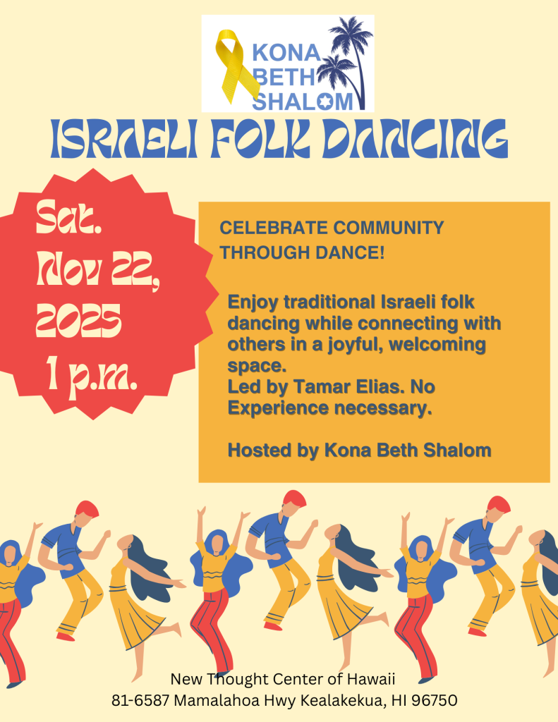 Following the service & our “Kiddush & Kibbitz” potluck, Tamar Elias will lead a session of Israel dance.