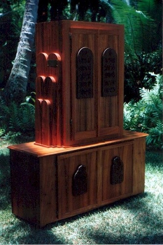 The Jewish Congregation of Maui gave us our first Aron HaKodesh at that time. In 2001, Joe Rosner, a long-time member of the Congregation, built a brand new Aron, designed by Morty Breier, using Hawaiian koa wood and incorporating that original Aron. Gifts from several KBS members (some deceased, some living) made possible the creation of this special home for our special scroll.